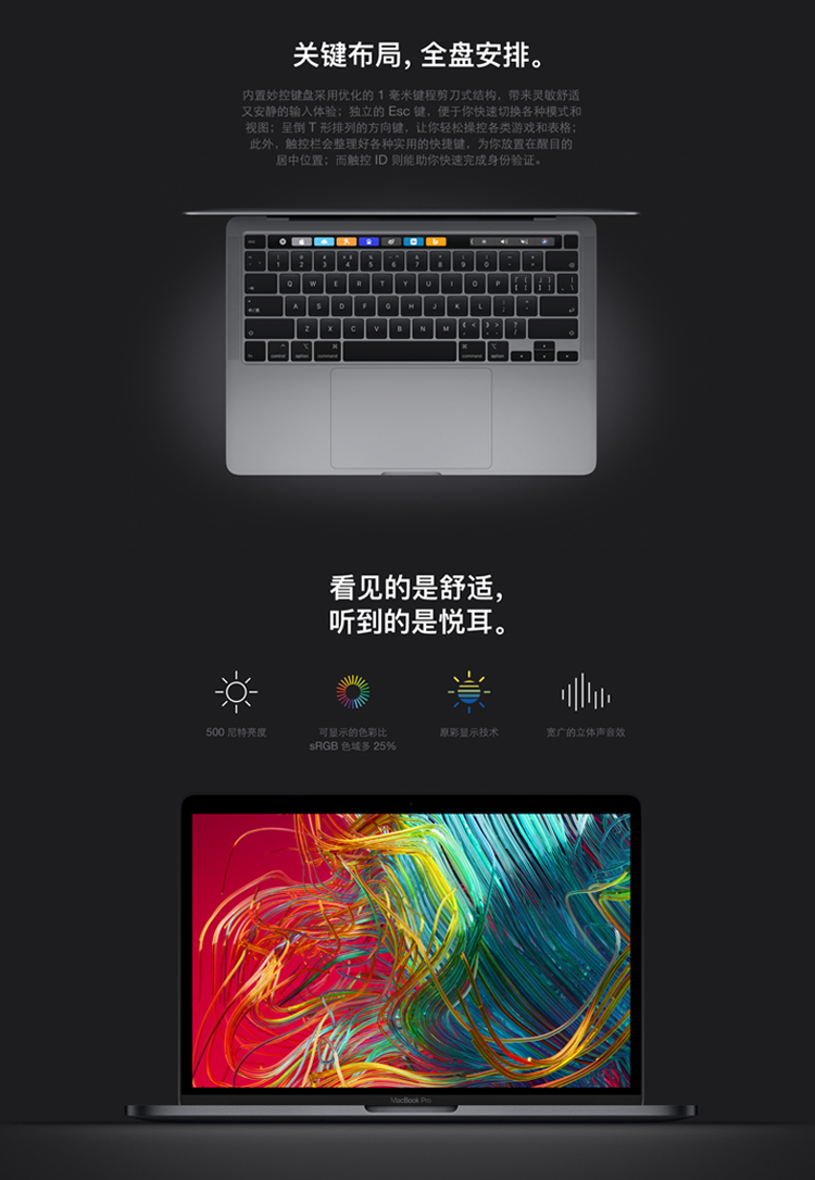 從細(xì)節(jié)來看,新款13英寸MacBook Pro輕盈纖薄,僅重1.4千克,厚度15.6毫米。還是"隨身的實力派",圖片處理速度最高可提升80%多,最高可選配32GB3733MHz內(nèi)存,最高可選配4TB固態(tài)硬盤。讓人心動的是可實現(xiàn)"關(guān)鍵布局,全盤安排":內(nèi)置妙控鍵盤采用優(yōu)化的1毫米鍵程剪刀式結(jié)構(gòu),帶來靈敏舒適又安靜的輸入體驗;獨(dú)立的Esc鍵,便于你快速切換各種模式和視圖;呈倒T形排列的方向鍵,讓你輕松操縱各類游戲和表格;此外,觸控欄會整理好各種使用的快捷鍵,為你放置在醒目的居中位置;而觸控ID則能助你快速實現(xiàn)身份驗證。