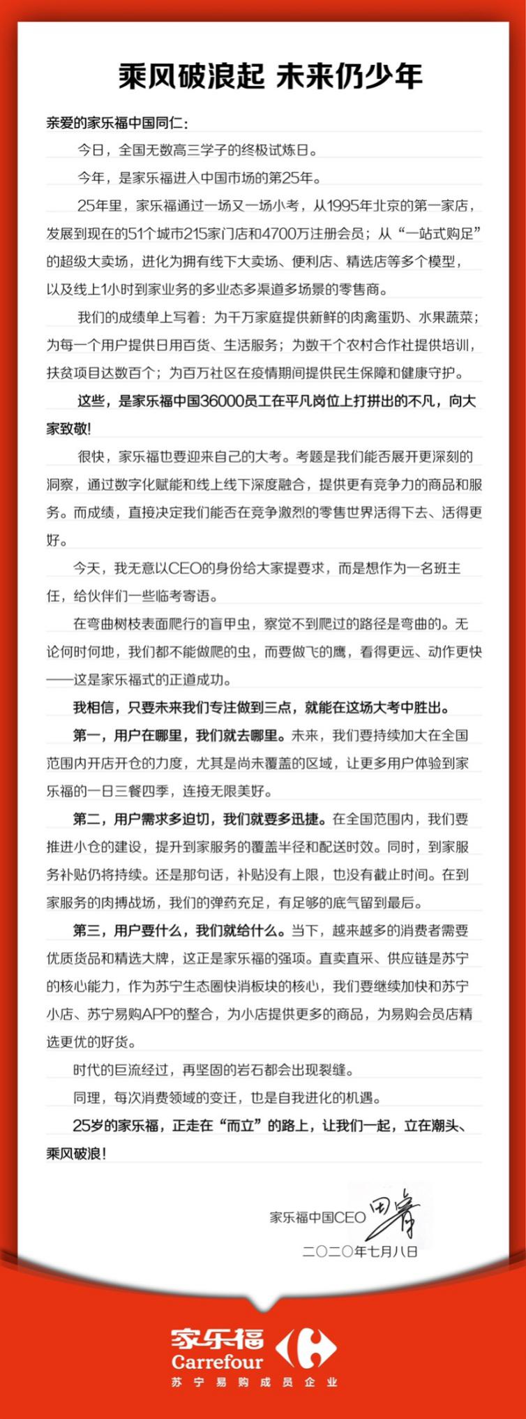 見圳客戶端·深圳新聞網(wǎng)2020年7月9日訊 今年,是家樂福進(jìn)入中國(guó)市場(chǎng)的第25個(gè)年頭。昨日,蘇寧家樂福CEO田睿發(fā)出內(nèi)部郵件,表示家樂?!盁o論何時(shí)何地,都不能做爬的蟲,而要做飛的鷹”,將持續(xù)加大在全國(guó)范圍內(nèi)開店開倉(cāng)的力度,并通過小倉(cāng)建設(shè)和補(bǔ)貼,提升到家服務(wù)的覆蓋半徑和配送時(shí)效。