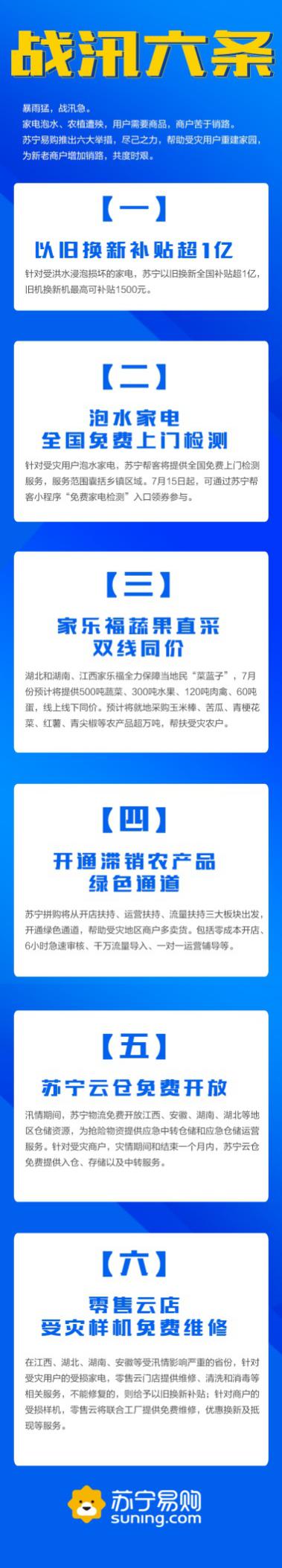 在江西、湖北、湖南、安徽等受汛情影響嚴(yán)重的省份,針對(duì)受災(zāi)用戶的受損家電,零售云門店也將提供維修、清洗和消毒,不能修復(fù)的,則給予以舊換新補(bǔ)貼。