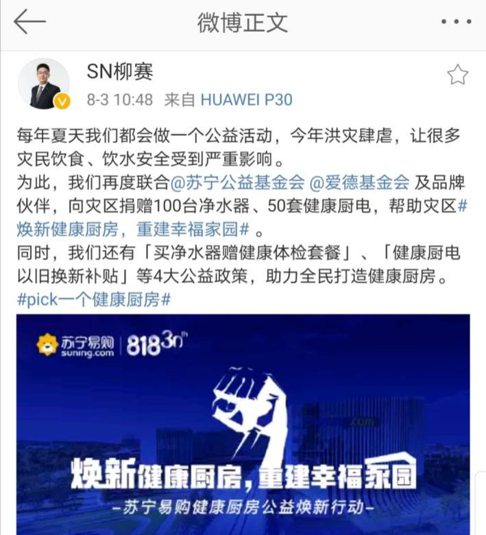 見圳客戶端·深圳新聞網(wǎng)2020年8月4日訊 昨日,蘇寧繼發(fā)布“戰(zhàn)汛六條”后,又聯(lián)合蘇寧公益、愛德基金會(huì)及老板電器、美的、A.O.史密斯、安吉爾、法迪歐、惠而浦等各大品牌,發(fā)起“煥新健康廚房,重建幸福家園”公益活動(dòng),面向?yàn)?zāi)區(qū)送出100臺(tái)凈水器、50套健康廚電,并向全民推出四大公益福利政策。