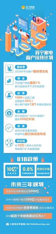 蘇寧宣布,2020年蘇寧將免收平臺(tái)商戶服務(wù)費(fèi);平臺(tái)上的商品供應(yīng)鏈會(huì)向蘇寧生態(tài)中10萬(wàn)+實(shí)體小店開(kāi)放,幫助商戶擴(kuò)大銷(xiāo)售通路。同時(shí),大家電行業(yè)線將持續(xù)給平臺(tái)商戶匹配站內(nèi)外的億級(jí)流量,并通過(guò)星河生態(tài)賦能平臺(tái)開(kāi)放1000+運(yùn)營(yíng)工具,針對(duì)核心商戶提供1對(duì)1專(zhuān)屬運(yùn)營(yíng)指導(dǎo),借此幫助商戶有效提升經(jīng)營(yíng)效率,降低運(yùn)營(yíng)成本。818期間,平臺(tái)訂單傭金從最低1%降至0.8%,針對(duì)核心單品提供雙百億補(bǔ)貼,且向平臺(tái)商戶給予10億+的流量導(dǎo)流扶持,幫助商戶全面應(yīng)戰(zhàn)818。