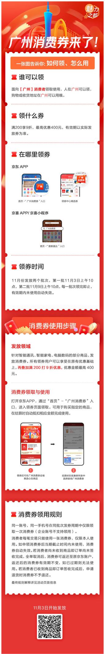 廣州消費(fèi)券將發(fā)放兩個批次,第一批于11月3日上午10點(diǎn)發(fā)放,第二批于11月9日上午10點(diǎn)發(fā)放,領(lǐng)完即止。廣州消費(fèi)券針對手機(jī)通訊、智能家電、電腦數(shù)碼等領(lǐng)域的熱銷產(chǎn)品,有效期6天。