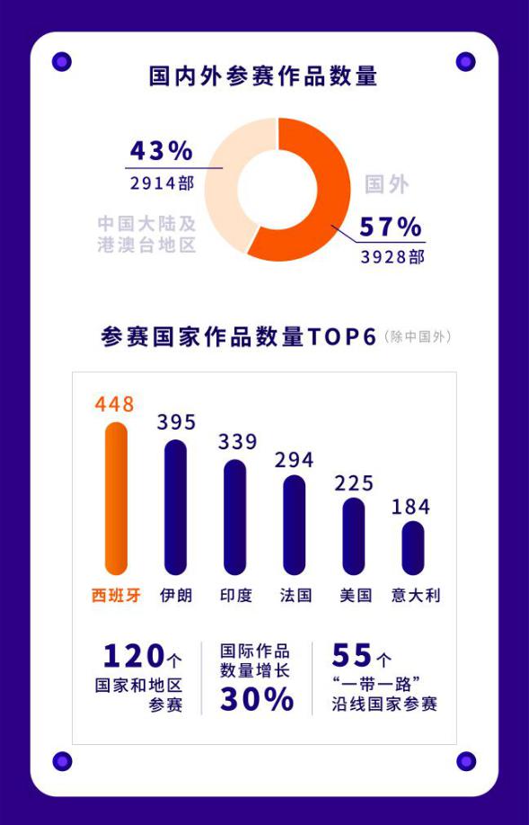 自今年9月中旬全球短片征集啟動以來,本屆短片節(jié)獲得來自世界各地創(chuàng)作者的積極響應(yīng),盡管受到新冠疫情影響以及遭遇影視產(chǎn)業(yè)寒冬,但本屆短片節(jié)參賽作品數(shù)量卻逆勢而上,并刷新歷史新高。而且,在今年的6842部參賽作品中,國際參賽作品多達(dá)3928部,數(shù)量較去年增長30%,占作品總量的57%。在今年參賽的120個國家和地區(qū)中,作品數(shù)量位居前六名的國家分別是西班牙(448部)、伊朗(395部)、印度(339部)、法國(294部)、美國(225部)和意大利(184部)。值得一提的是,作為深圳市參與“一帶一路”建設(shè)重點項目,短片節(jié)今年吸引了來自“一帶一路”沿線的55個國家參賽,約占目前65個“一帶一路”沿線國家數(shù)的85%,短片節(jié)作為推動“一帶一路”沿線國家間人文交流、促進(jìn)全球跨文化傳播的重要平臺的作用日益凸顯,國際化進(jìn)一步走向深入。