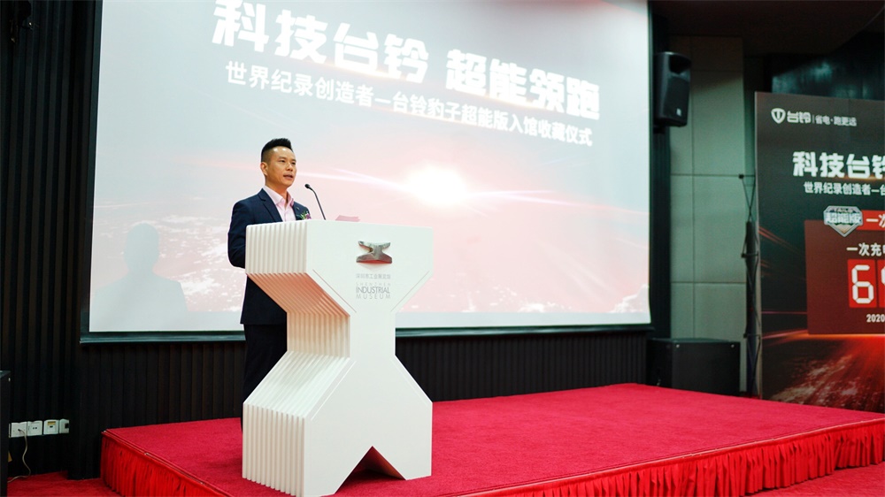 深圳市工業(yè)展覽館副館長潘文峰,深圳電動(dòng)車產(chǎn)業(yè)促進(jìn)委員會(huì)執(zhí)行會(huì)長楊華,臺(tái)鈴集團(tuán)董事長孫木鉗、臺(tái)鈴集團(tuán)總裁助理兼公關(guān)總監(jiān)胡東文等嘉賓齊聚深圳市工業(yè)展覽館,參加了以“科技臺(tái)鈴超能領(lǐng)跑”為主題的世界紀(jì)錄創(chuàng)造者——臺(tái)鈴豹子超能版入館收藏儀式,共同見證了這一榮光時(shí)刻。