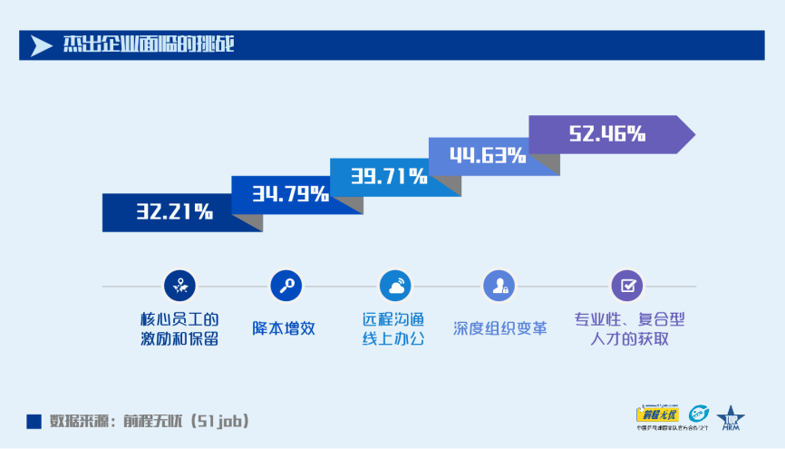 2020年杰出企業(yè)招聘員工總數(shù)較2019年增長了4.21%;55.48%的企業(yè)預(yù)計人均招聘成本呈增長趨勢,在此前提下,依然有56.04%的企業(yè)預(yù)計會在2021年擴(kuò)大招聘來獲取人才優(yōu)勢。894家獲獎企業(yè)中,有469家將“為籌備未來招募新團(tuán)隊(duì),加大專業(yè)性人才和復(fù)合型人才的獲取“列為本年度企業(yè)人力資源管理所面臨的最大的挑戰(zhàn)。