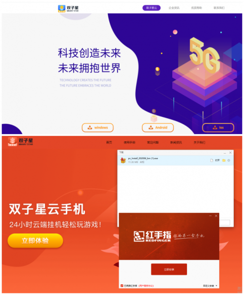 上圖為雙子星云手機官網,下圖為紅手指仿照雙子星的官網