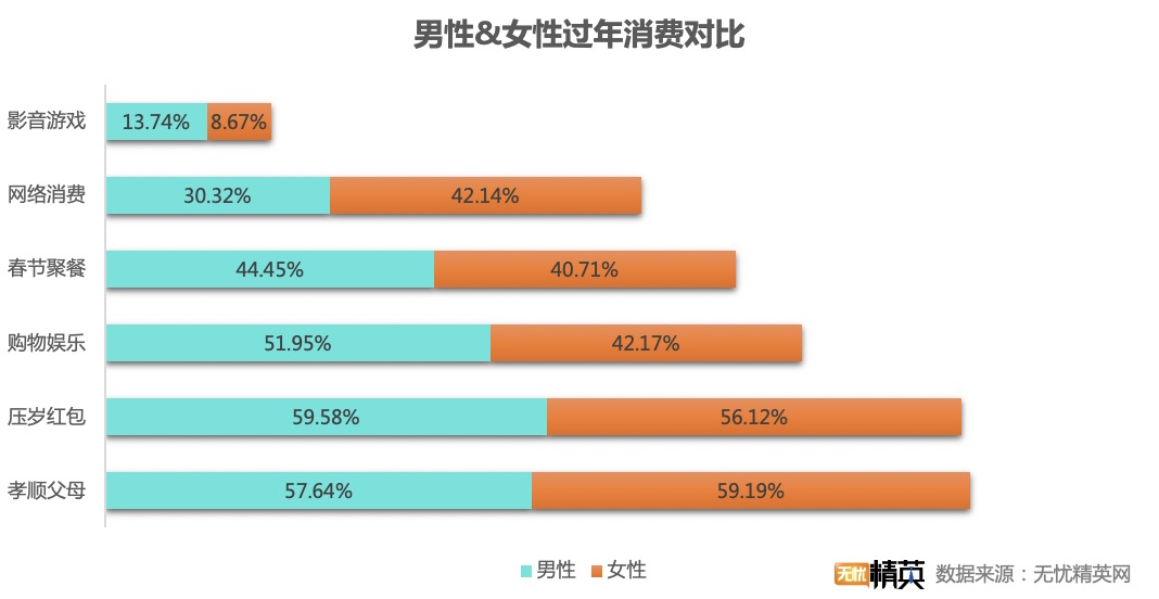 同時(shí)為了更好的了解今年的原地過年的消費(fèi)變化,針對男女消費(fèi)的差異,我們對調(diào)研者進(jìn)行了深入了解。在今年春節(jié)的消費(fèi)投入上,不論男女,上班族春節(jié)的開銷基本都在月薪的150%-200%之間,在開銷習(xí)慣上男女上班族整體比較接近,其中女性孝敬父母的開銷比例達(dá)到59.19%,比男性略高。春節(jié)疫情防控期間減少了非必要外出,網(wǎng)購年貨的方式遇上女性偏愛的網(wǎng)購習(xí)慣,打折與網(wǎng)店紅包,年貨、衣服、化妝品、包包等等,買買買簡直停不下手,使得這部分的支出占春節(jié)開銷的首位,并且還比男性高出約12%。同時(shí)春節(jié)期間電影票漲價(jià),手機(jī)與網(wǎng)絡(luò)游戲更是老套路在春節(jié)期間推出各種氪金活動(dòng)與商品,比如王者榮耀一款皮膚價(jià)格在77塊到177塊之間,春節(jié)期間一口氣推出了近十套皮膚,讓原地過年的宅男宅女們又多了一筆不菲開銷。而男性在游戲上的癡迷度與投入一項(xiàng)都會(huì)高于女性,春節(jié)期間影音游戲的支出高出了女性約6%點(diǎn)。