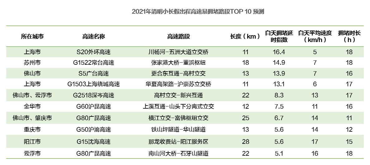 清明期間,最易擁堵路段有哪些?數(shù)據顯示,4月3日全國高速出程較易擁堵的路段主要是上海S20外環(huán)高速,白天擁堵延時指數(shù)達16.4,平均速度僅為5千米/小時,其次是G1522常臺高速蘇州段以及S5廣臺高速佛山段。