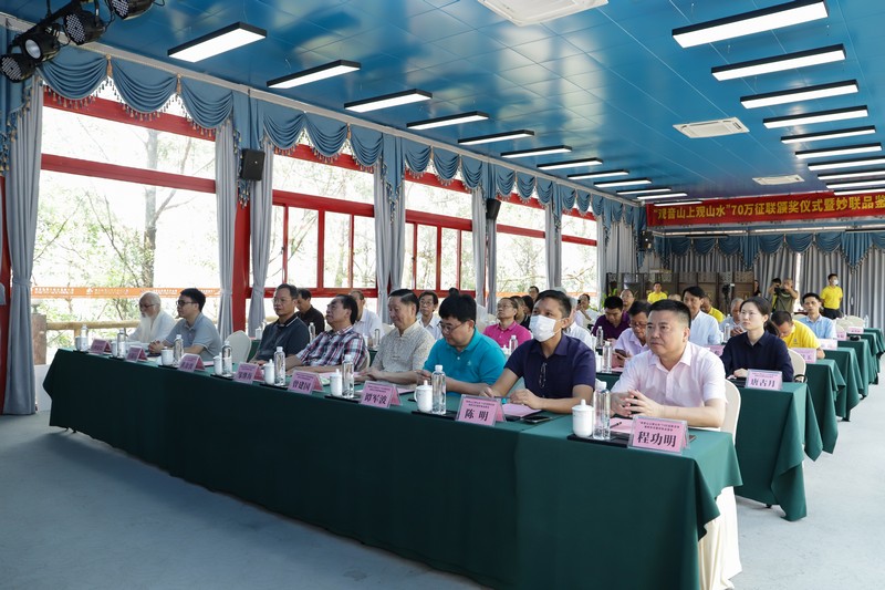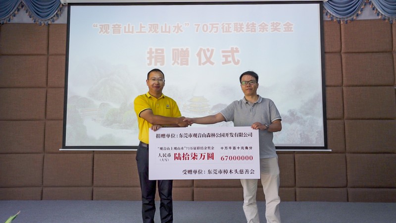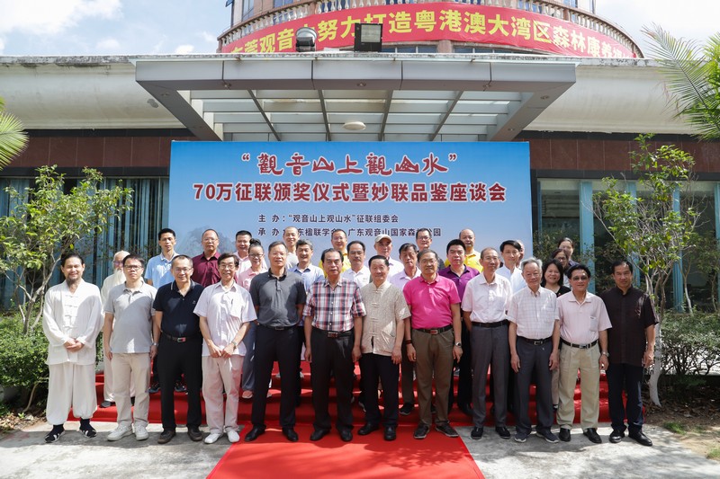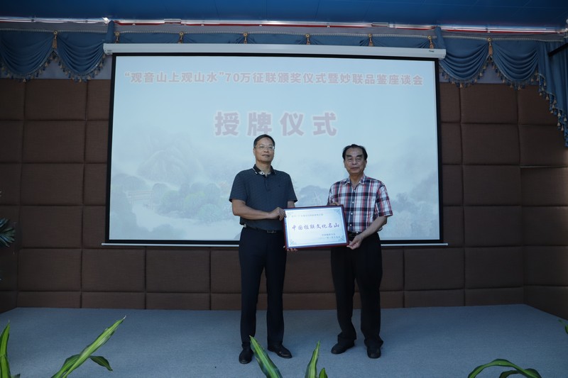 見(jiàn)圳客戶端·深圳新聞網(wǎng)2021年5月18日訊(記者 常軍平)“觀音山上觀山水”70萬(wàn)征聯(lián)活動(dòng)終有結(jié)果,評(píng)選出15句優(yōu)秀下聯(lián),最佳下聯(lián)空缺,并于5月17日在東莞觀音山舉行了頒獎(jiǎng)儀式及妙聯(lián)品鑒座談會(huì)?;顒?dòng)現(xiàn)場(chǎng),楹聯(lián)家們雅聚一堂,共同見(jiàn)證了本次征聯(lián)活動(dòng)優(yōu)秀獎(jiǎng)的頒出。以楹聯(lián)為媒,進(jìn)行交流互動(dòng)?;顒?dòng)期間,組委會(huì)代表東莞觀音山將結(jié)余款項(xiàng)67萬(wàn)元悉數(shù)捐給東莞樟木頭鎮(zhèn)慈善會(huì)。鑒于觀音山在推動(dòng)楹聯(lián)文化的傳承發(fā)展做出的突出貢獻(xiàn),被中國(guó)楹聯(lián)學(xué)會(huì)授予“中國(guó)楹聯(lián)文化名山”稱號(hào)。
