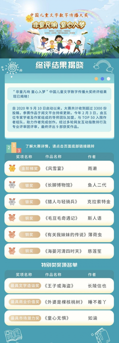 深圳新聞網(wǎng)2021年6月1日訊“非童凡響童心入夢”中國兒童文學(xué)數(shù)字傳播大獎6月1日揭曉終評結(jié)果,《風(fēng)雪宴》等9部參賽作品從3300余部作品中脫穎而出。大獎終評頁面已在人民日報數(shù)字傳播有限公司旗下“人民閱讀”平臺、中國中福會出版社、閱文集團(tuán)等平臺全面上線。