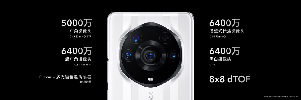 其中主攝采用索尼IMX766傳感器,擁有1/1.56英寸超大傳感器尺寸;6400萬(wàn)像素潛望式長(zhǎng)焦鏡頭,不僅具有主攝級(jí)別鏡頭品質(zhì),同時(shí)還支持3.5x光學(xué)變焦,10x混合變焦,100x數(shù)字變焦,以及OIS光學(xué) +EIS電子雙重防抖,讓遠(yuǎn)方的風(fēng)景可以更加清晰,而且3.5倍光學(xué)變焦焦段接近90 mm黃金焦段,在人像拍攝場(chǎng)景中也擁有更優(yōu)秀的表現(xiàn);8*8 d ToF激光對(duì)焦,最多可獲得64個(gè)區(qū)域的不同深度信息,從而實(shí)現(xiàn)大范圍的精準(zhǔn)對(duì)焦。