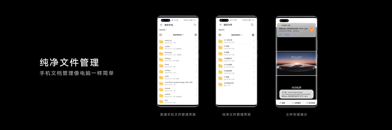 為了幫助事務(wù)繁多的商務(wù)人士更高效管理個(gè)人事務(wù),榮耀還與各辦公平臺(tái)合作,讓用戶在釘釘、飛書(shū)、Welink、WPS辦公平臺(tái)的日程均能通過(guò)榮耀Magic3系列進(jìn)行統(tǒng)一管理。而新增的純凈文件管理系統(tǒng)(此功能后續(xù)通過(guò) OTA升級(jí)支持),則使榮耀Magic3系列在文件保存和管理方面進(jìn)行進(jìn)一步簡(jiǎn)化,讓手機(jī)文件管理從此可以像電腦一樣簡(jiǎn)單便捷。