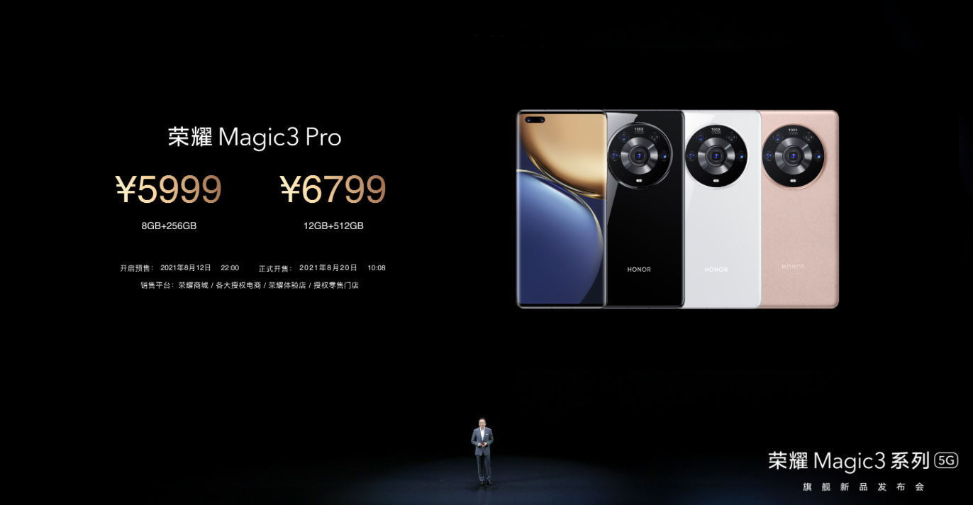 榮耀 M agic38GB+128GB版售價(jià)4599元,8GB+256GB版售價(jià)4999元;榮耀Magic3 Pro8GB+256GB版售價(jià)5999元,12GB+512GB版售價(jià)6799元;榮耀Magic3至臻版12GB+512GB售價(jià)7999元。8月12日22:00榮耀 Magic3系列手機(jī)正式開(kāi)啟預(yù)售,8月20日10點(diǎn)08分,榮耀 M agic3系列手機(jī)將于榮耀商城、各大授權(quán)電商、榮耀體驗(yàn)店、榮耀零售門(mén)店等全平臺(tái)開(kāi)售。