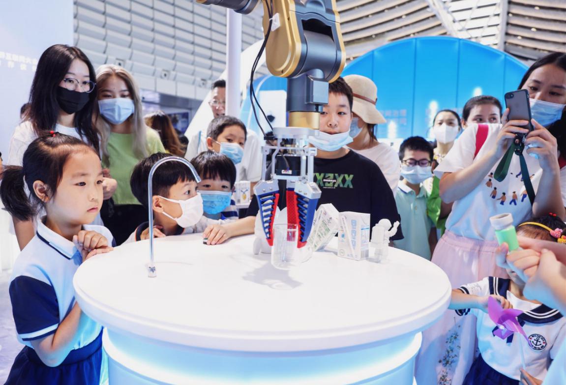 這牛奶和其他的不太一樣,很香濃?!半x心精萃‘白科技’開啟臻濃新紀(jì)元”展臺(tái)一直就是博覽會(huì)現(xiàn)場的“人氣王”,這里以宇宙探索為主題,科幻感十足,火箭發(fā)動(dòng)機(jī)噴出淡淡煙霧,三臺(tái)智能機(jī)械臂不停忙碌,人們排起長隊(duì),品嘗由“離心精萃科技”現(xiàn)場調(diào)制的伊利臻濃牛奶。在這里,吸引觀眾的不僅是美味的伊利牛奶,也有滿滿的數(shù)字科技。