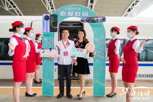 10月28日上午,索愛集團(tuán)董事長(zhǎng)劉建佳、總經(jīng)理全雪梅、華鐵傳媒集團(tuán)廣州分公司銷售總經(jīng)理劉延群等領(lǐng)導(dǎo)嘉賓共同為冠名發(fā)車儀式揭幕、剪彩、互贈(zèng)紀(jì)念禮品,在現(xiàn)場(chǎng)嘉賓的共同見證下,張貼索愛全新品牌代言人陳小春夫婦形象宣傳海報(bào)的“索愛-為音樂(lè)而生”高鐵冠名列車正式啟程。