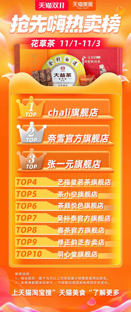 今年“雙11”電商購(gòu)物節(jié)比往年更早開(kāi)啟,10月20日晚8點(diǎn)便拉開(kāi)序幕,奈雪的茶隨之推出滿減、秒殺等多項(xiàng)優(yōu)惠活動(dòng)。奈雪此次雙11迎來(lái)開(kāi)門(mén)紅,數(shù)據(jù)顯示,11月1日凌晨開(kāi)售后僅10分鐘,奈雪的茶的銷(xiāo)售總額便突破去年全天。11月1日-3日,伴隨著茶禮盒等產(chǎn)品的熱銷(xiāo),奈雪躋身花草茶銷(xiāo)售額排行榜TOP2。