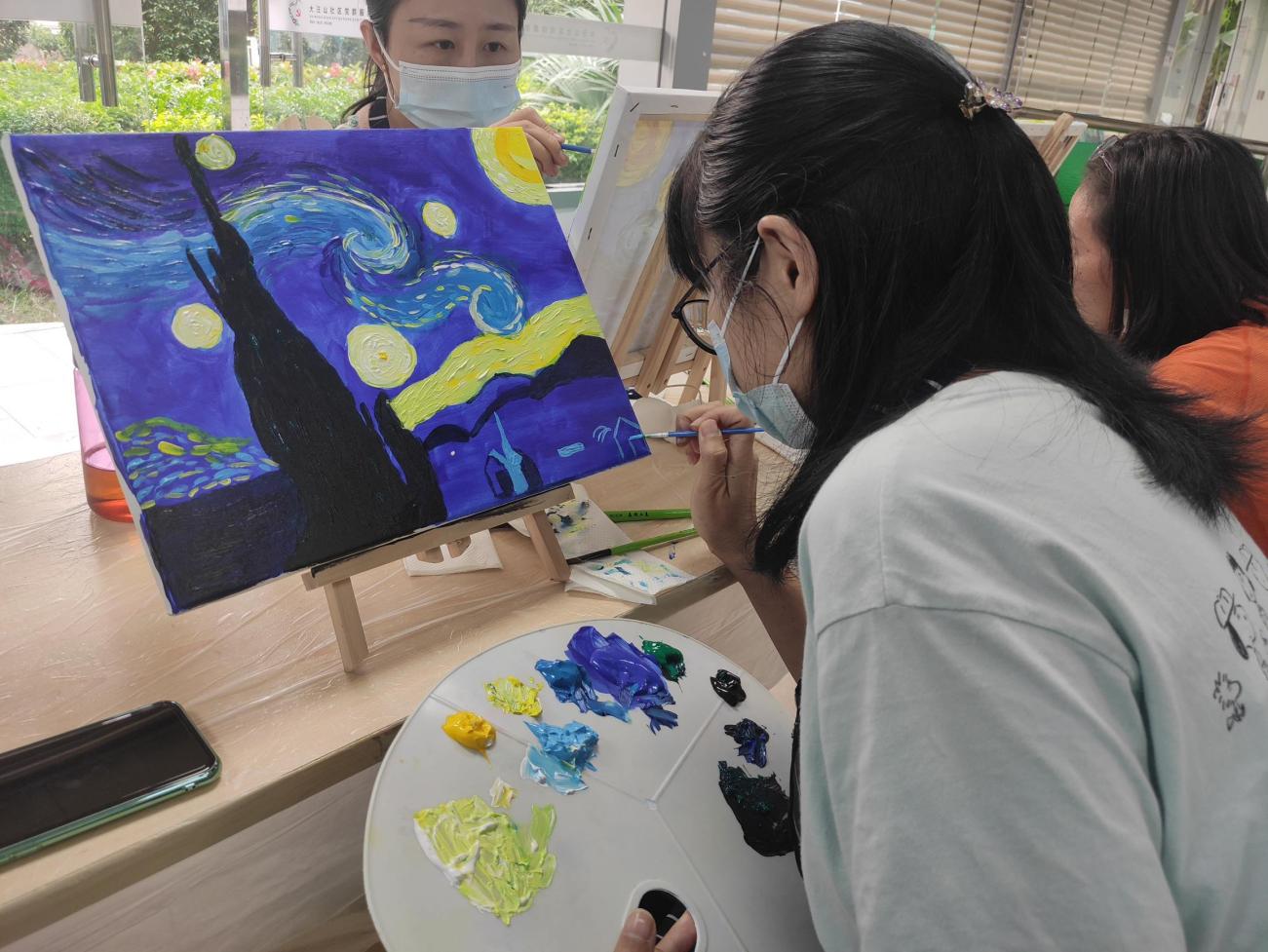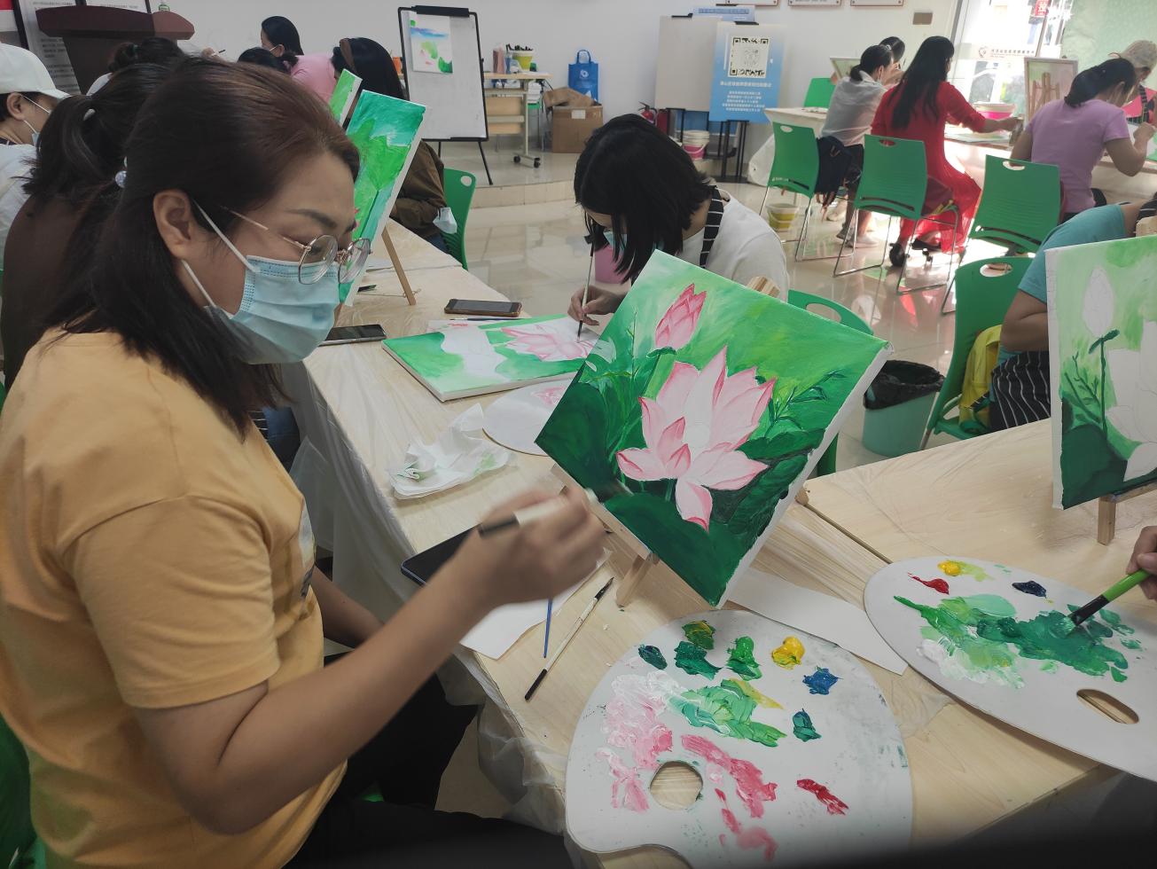 全職媽媽,這個平凡而偉大的群體,操持家務、陪伴孩子、全年無休,為此犧牲了自己的興趣愛好,交際圈、經濟收入。大汪山社區(qū)關注媽媽身心健康,以“油畫”搭建平臺,為全職媽媽們創(chuàng)造減壓、專注、有趣的“個人時間”。在這里,媽媽們暫時放下孩子的作業(yè)、未洗的衣服、未做的晚飯,專注于和畫筆、顏料、畫友相處的時間:油畫基礎、畫面結構、色彩調配、色彩層次……