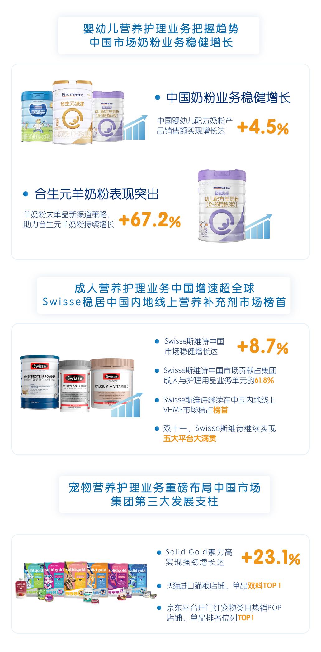 其中,嬰幼兒營養(yǎng)及護理用品業(yè)務(wù)單元(BNC)中的中國市場奶粉業(yè)務(wù)銷售額實現(xiàn)4.5%增長;成人營養(yǎng)及護理用品業(yè)務(wù)單元(ANC)銷售額全球升勢明顯,達5.8%,其中ANC中國市場增幅達8.7%;寵物營養(yǎng)及護理用品業(yè)務(wù)單元(PNC)營收達3.45億元,Solid Gold素力高同比增長達23.1%, PNC中國市場在PNC業(yè)務(wù)單元占比41.1%。