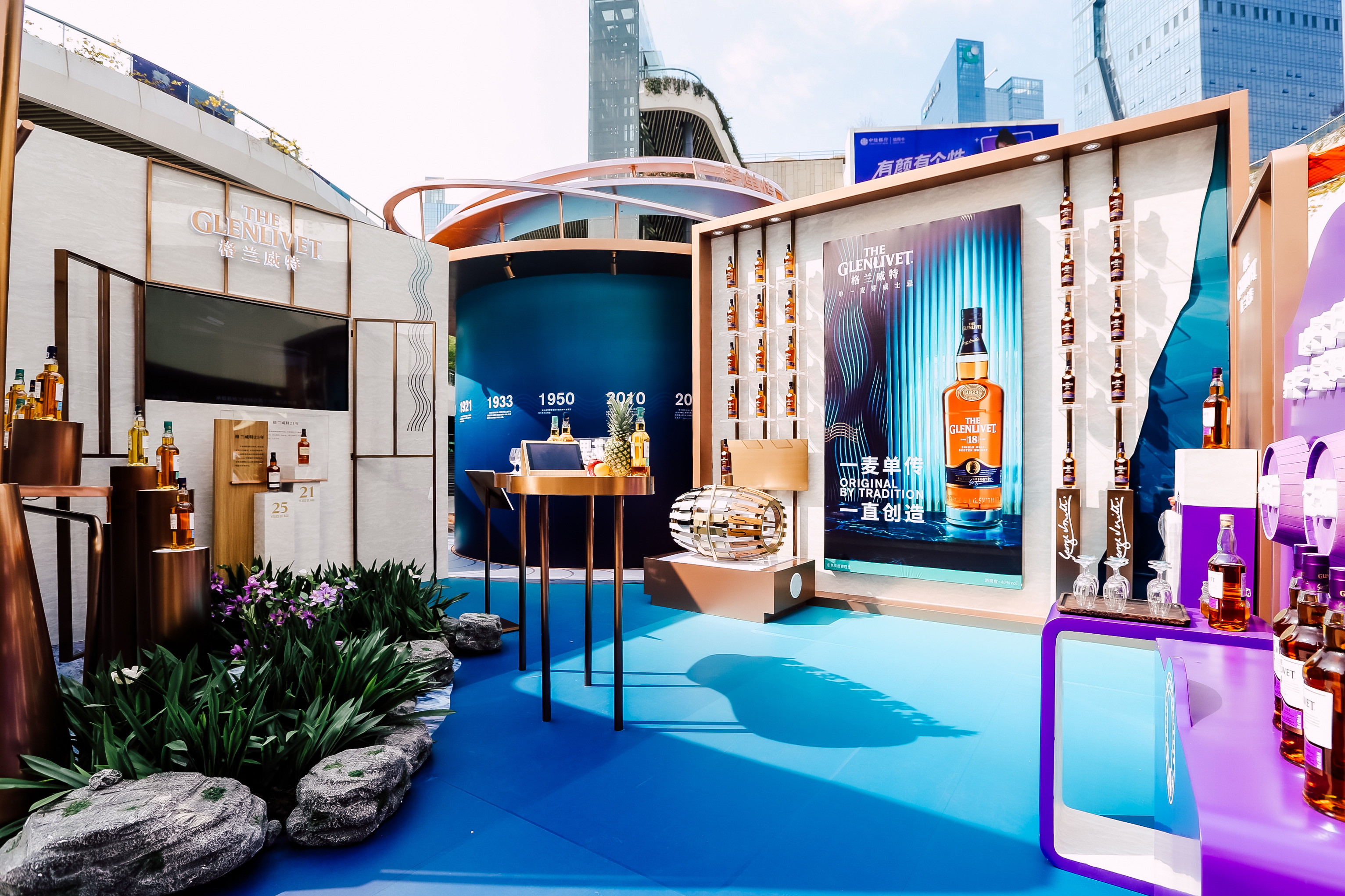 創(chuàng)造不止步,格蘭威特不斷尋求產(chǎn)品革新,創(chuàng)造了以花果芬芳和馥郁口感為特色的諸多單一麥芽威士忌佳釀。步入時(shí)光穿梭酒廠的“傳承與創(chuàng)造”空間,花果芳香綻放,充滿自然氣息的環(huán)境中呈現(xiàn)了格蘭威特豐富的產(chǎn)品組合以及其獨(dú)特的優(yōu)雅細(xì)致風(fēng)格??臻g一側(cè)重點(diǎn)展示了品牌的經(jīng)典之作——格蘭威特18年,作為醇厚均衡的單一麥芽威士忌佳釀,它是歲月與優(yōu)雅的詮釋,芳醇柔滑,酒體均衡。此外,另一款全新威士忌臻品——格蘭威特14年干邑桶陳釀也在空間另一側(cè)隆重展出。歷經(jīng)美國威士忌桶與雪莉桶至少14年的陳年之后,精選部分酒液換桶陳年于高品質(zhì)法國干邑橡木桶,格蘭威特14年干邑桶陳釀?chuàng)碛酗枬M且濃郁的甜美風(fēng)味,并創(chuàng)新地將白蘭地香氣與品牌標(biāo)志性的優(yōu)雅細(xì)致花果香融為一體,加上瓶身奪目的紫色設(shè)計(jì),威士忌愛好者可以通過參與現(xiàn)場(chǎng)品鑒挑戰(zhàn)贏取品鑒機(jī)會(huì),解鎖別具一格的風(fēng)味之旅。