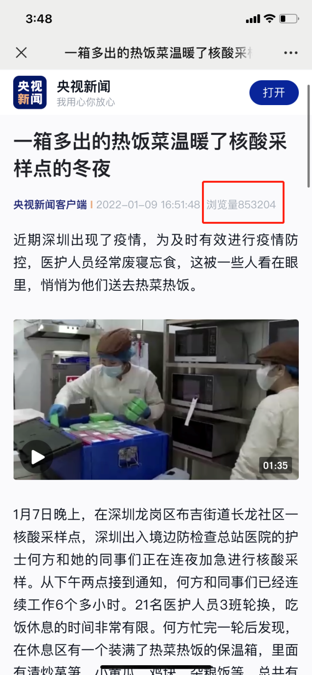 1月9日,一篇名為《一箱多出的熱飯菜溫暖了核酸采樣點的冬夜》的報道登上了央視新聞。在深圳全民抗疫期間,“維小飯”為核酸檢測醫(yī)護人員偷偷送上用保溫箱裝好的熱飯熱菜,獲網(wǎng)友紛紛點贊:你永遠可以相信“深圳速度”,也永遠可以相信“深圳創(chuàng)新”。央視新聞報道之后,熱度持續(xù)不減?!吧顝V電第一現(xiàn)場”“羊城晚報”“光明網(wǎng)”“中國青年網(wǎng)”等權(quán)威媒體也將此事件進行了報道,引發(fā)眾網(wǎng)友熱議。