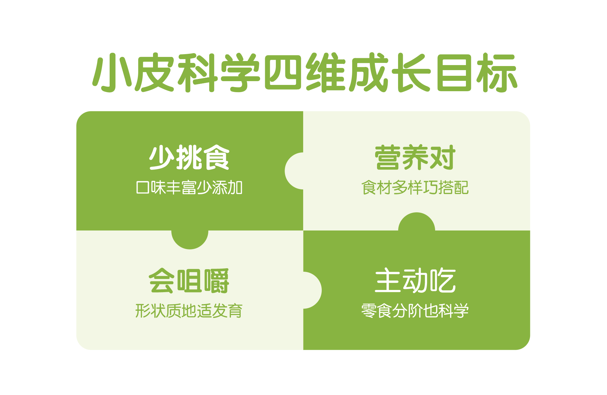 2017年,我國將“生命早期1000天營養(yǎng)健康行動”列為國民營養(yǎng)計(jì)劃重大行動之一,但相比孕產(chǎn)期與新生兒階段已覆蓋完善的營養(yǎng)指導(dǎo)來說,輔食階段的科學(xué)喂養(yǎng)關(guān)注程度與認(rèn)知教育還有待提升。在此背景下,小皮基于嚴(yán)謹(jǐn)?shù)目茖W(xué)研究提出《6-36月齡嬰幼兒四維科學(xué)喂養(yǎng)方案》,并通過中國食品科學(xué)技術(shù)學(xué)會權(quán)威論證,旨在幫助寶寶建立起“少挑食、營養(yǎng)對、會咀嚼、主動吃”的健康飲食習(xí)慣。