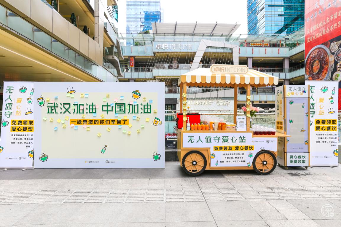 3月3日至3月8日卓悅INTOWN在街頭專設(shè)了一個(gè)”無人值守愛心站”,用愛心餐車上放滿了食物冷/熱飲,專門免費(fèi)贈送給快遞、外賣小哥、環(huán)衛(wèi)工人、警察、城管等一線奔波的人員。