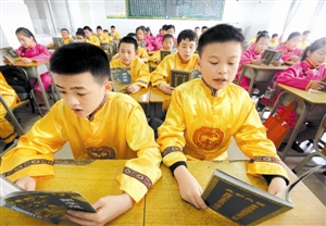 據(jù)悉,寶龍學(xué)校是寶安區(qū)第一所民辦學(xué)校,在校學(xué)生絕大多數(shù)為勞務(wù)工子女。孩子們的父母常常因忙于工作,而忽略了對他們的傳統(tǒng)道德教育。“剛學(xué)文化知識時不懂得基本禮儀是多數(shù)孩子的通病,很多孩子初入社會很難適應(yīng)?!痹撔6麻L陳寶元表示,學(xué)校從上學(xué)期開始就從校外引進(jìn)國學(xué)老師,每天教授孩子們誦讀國學(xué)經(jīng)典。圖為寶龍學(xué)校的師生在課前齊誦國學(xué)經(jīng)典。