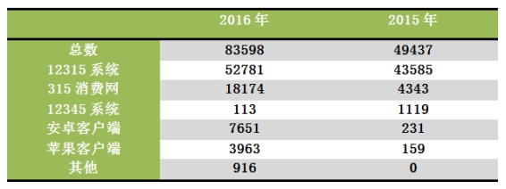 2016年,深圳市、區(qū)消委會共接受消費者投訴83598宗,比2015年的49437宗增長了69.10%,為消費者挽回損失2.1億元。其中,52781宗來源于12315系統(tǒng),占63.13%;“315消費通”的網頁端、手機端、微信端已經成為另一消費者投訴主渠道,全年共接收消費者投訴30552宗,占36.55%,比去年的9.57%提高了27%。如表1所示。