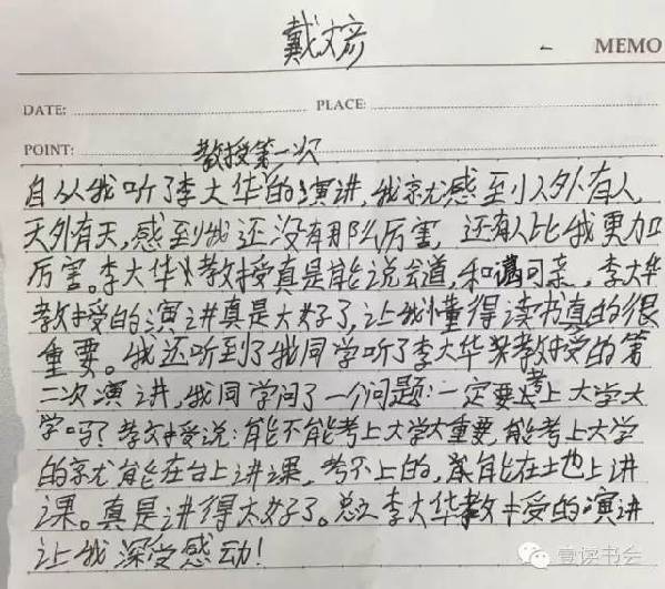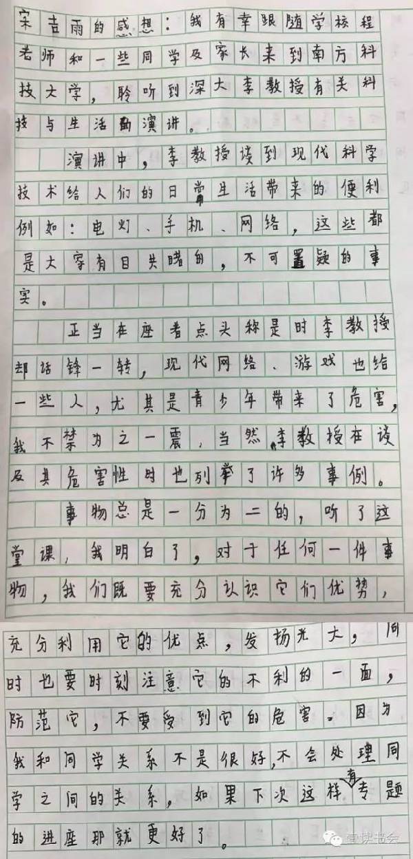 近日,多位小朋友特地就這次講座表達(dá)感想。他們紛紛盛贊講座深刻,令其受益匪淺,“深受感動(dòng)”。他們紛紛在感想里提到李教授平易近人,講課精彩,更在聽(tīng)完李教授的課后開(kāi)始反思現(xiàn)代科技與當(dāng)代生活,提升自身思想和文化水平。