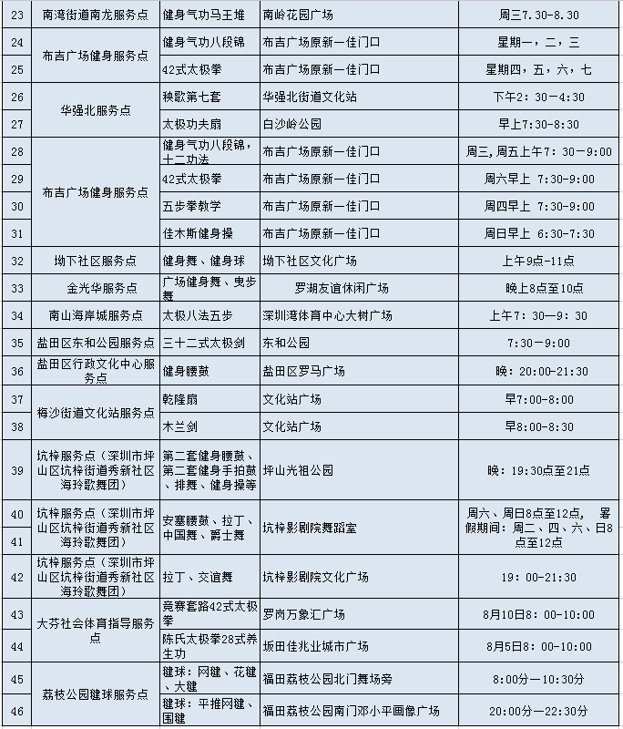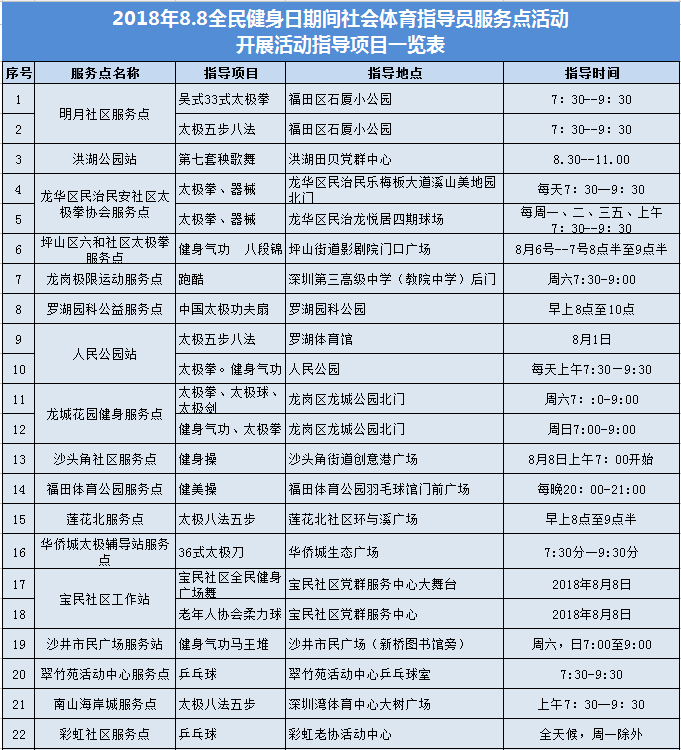 ????2018年8月8日,經(jīng)深圳市文體旅游局統(tǒng)計,在“全民健身日”期間,深圳將有近50個全民健身站點,為市民提供健身科普、大講堂、免費咨詢及健身指導等,健身內(nèi)容涵蓋武術(shù)、舞蹈、健身操、球類等眾多項目。
