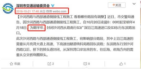 據(jù)市交委于2016年10月21日發(fā)布的通告稱,沙河西路與西部通道側(cè)接線工程(即東濱路隧道匝道工程)的施工時間計劃為2016年10月20日凌晨0:00時起至2017年4月18日,為期半年。期間將封閉沙河西從路南行s3廣深沿江高速進(jìn)口及s3東行東濱路出口。