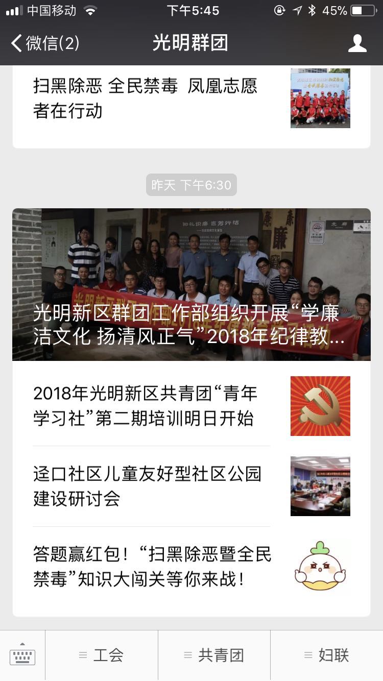 案例介紹:深圳市光明新區(qū)群團工作部公眾賬號,包括光明工會、光明團委、光明婦聯(lián),發(fā)布新聞資訊、提供便捷服務。