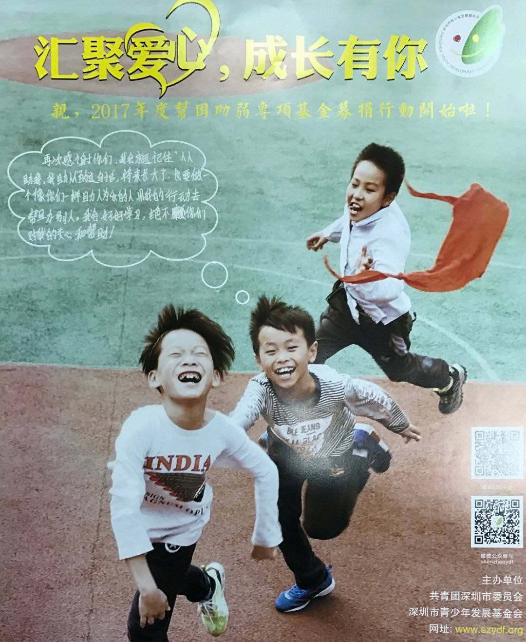 為關(guān)心關(guān)愛青少年健康成長,營造樂觀、積極向上的社會氛圍,深圳農(nóng)商行發(fā)起了“匯聚愛心成長有你”的公益愛心活動,號召全行向2017年度深圳市青少年幫困助弱專項基金進行愛心捐助。活動得到了全行上下的大力支持,全行共募集善款人民幣221156.66元。青基會對深圳農(nóng)商行員工的善舉表示了深深的謝意,并期待與深圳農(nóng)商行開展更廣泛、更深入的公益活動合作。