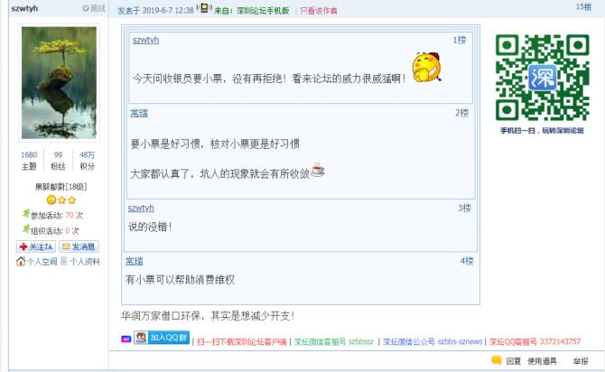 記者從問(wèn)政平臺(tái)得知,5月底以來(lái),還有市民發(fā)帖反映,除華潤(rùn)萬(wàn)家外,科技園萬(wàn)象天地華潤(rùn)Ole、僑香路沃爾瑪?shù)瘸幸泊嬖诓惶峁┘堎|(zhì)購(gòu)物小票的情況。目前,市民仍然普遍認(rèn)同超市應(yīng)主動(dòng)提供紙質(zhì)購(gòu)物小票,避免顧客被價(jià)格欺詐。有市民表示:“遇到最多的是優(yōu)惠打折,實(shí)際還是原價(jià)買單,這時(shí),手中有小票一目了然,不花冤枉錢?!边€有市民質(zhì)疑,“奸商,動(dòng)不動(dòng)就打著環(huán)保這些高大上的理由作借口”。同時(shí),也有市民體驗(yàn)過(guò)微信小票后表示,“沃爾瑪手機(jī)掃碼付款是沒(méi)有紙票,購(gòu)物小票藏在微信公眾號(hào)里,退換貨就在那里面進(jìn)行。這就是科技發(fā)達(dá)帶來(lái)的豐碩成果,挺好的?!苯刂劣浾甙l(fā)稿時(shí),市民關(guān)于科技園萬(wàn)象天地華潤(rùn)Ole、僑香路沃爾瑪?shù)瘸胁惶峁┵?gòu)物小票的帖文還沒(méi)有得到相關(guān)部門回應(yīng)。