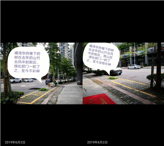 “南山區(qū)城管局當(dāng)時(shí)回應(yīng)道:‘因臺(tái)風(fēng)砍倒的樹(shù)木將會(huì)統(tǒng)一采購(gòu),盡快予以補(bǔ)種;有問(wèn)題的路牌將于七月底前更換。會(huì)盡快聯(lián)系南山稅務(wù)部門,修復(fù)有問(wèn)題的井蓋’”,該市民卻對(duì)管理部門的工作效率提出質(zhì)疑:“然而現(xiàn)在距離投訴已經(jīng)兩個(gè)月了,問(wèn)題依然存在。工作效率如此之低?”