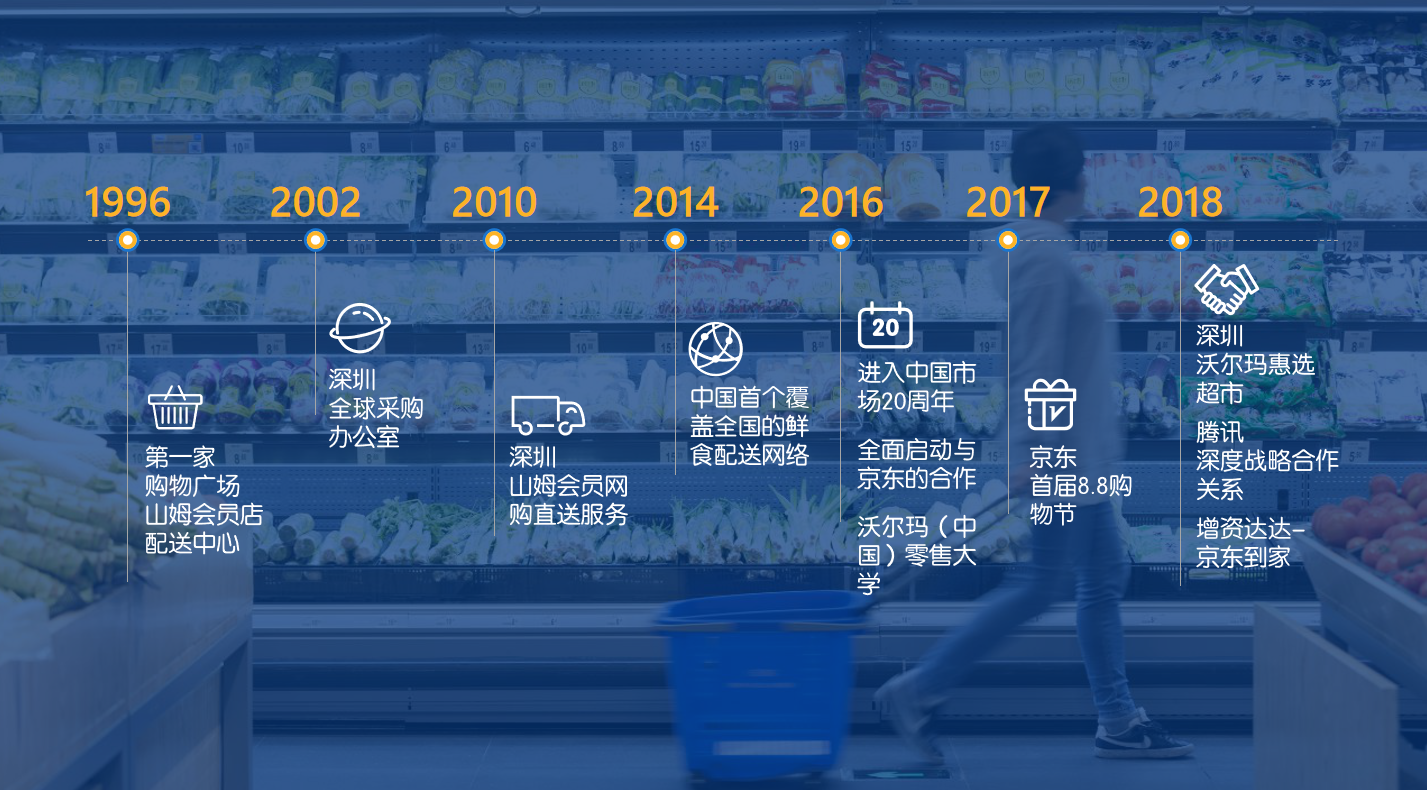 沃爾瑪于1996年在深圳開設(shè)中國第一家沃爾瑪購物廣場和山姆會員商店。進駐中國20余年,擁有員工約10萬。沃爾瑪目前已經(jīng)在全國180多個城市開設(shè)了400多家商場、9家干倉配送中心和11家鮮食配送中心。沃爾瑪中國與超過7,000家供應商建立了合作關(guān)系。
