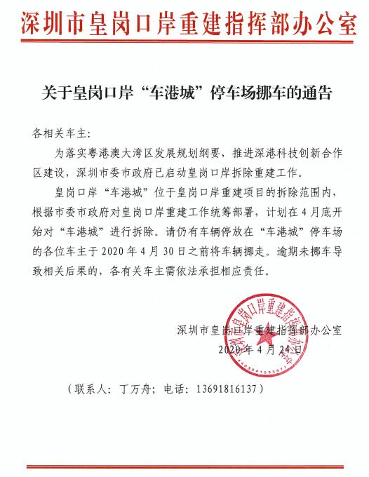 據(jù)了解,皇崗口岸“車港城”位于皇崗口岸重建項(xiàng)目的拆除范圍內(nèi),根據(jù)市委市政府對(duì)皇崗口岸重建工作統(tǒng)籌部署,計(jì)劃在4月底開始對(duì)“車港城”進(jìn)行拆除。請(qǐng)仍有車輛停放在“車港城”停車場(chǎng)的各位車主于2020年4月30日之前將車輛挪走,逾期未挪車導(dǎo)致相關(guān)后果的,各有關(guān)車主需依法承擔(dān)相應(yīng)責(zé)任。