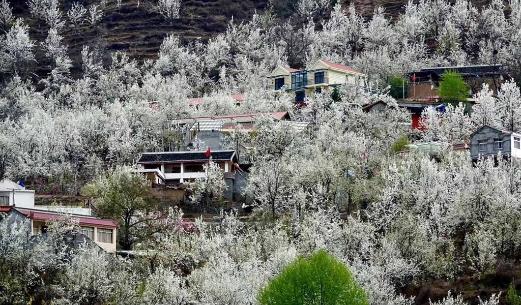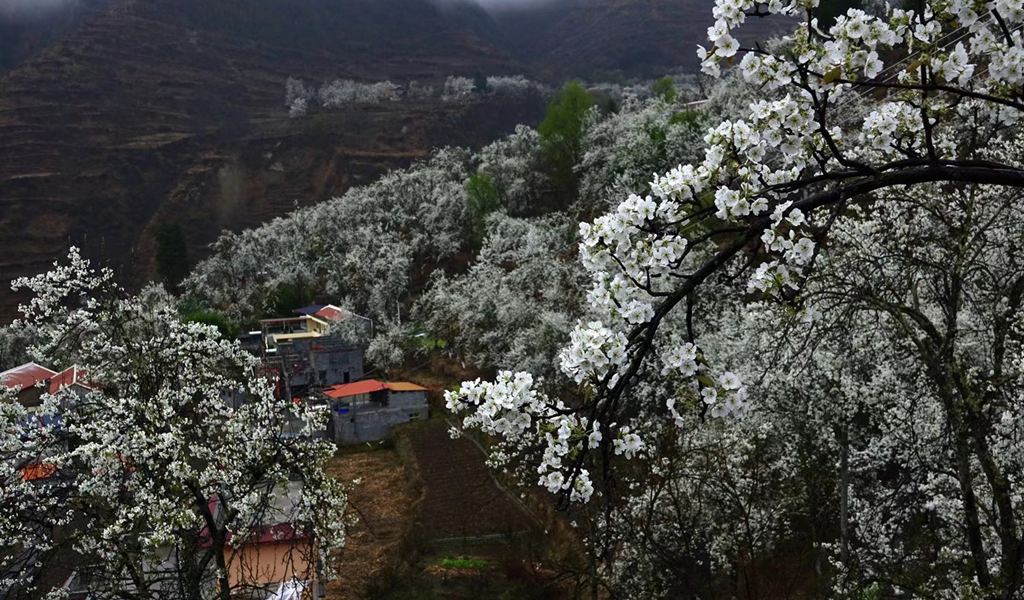每年三到四月,金川縣的上百萬株梨樹在春日照耀下盛開白花,萬畝梨海、百里吐蕊。李仁奇 攝