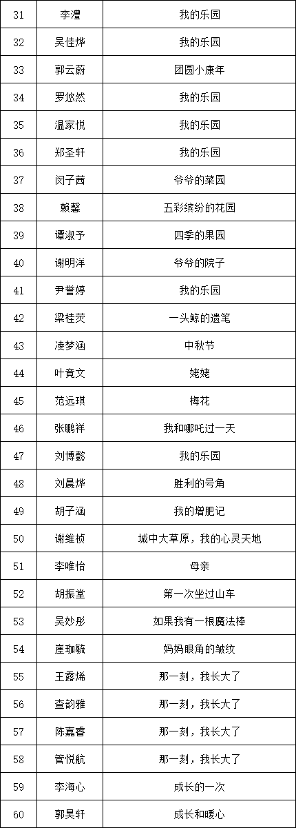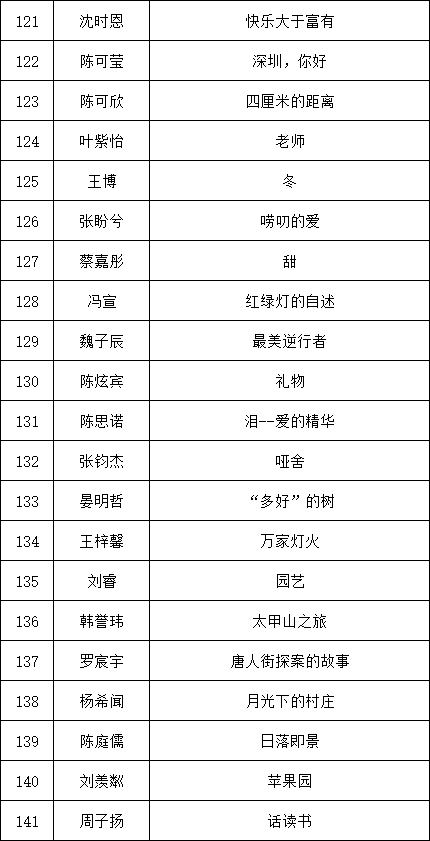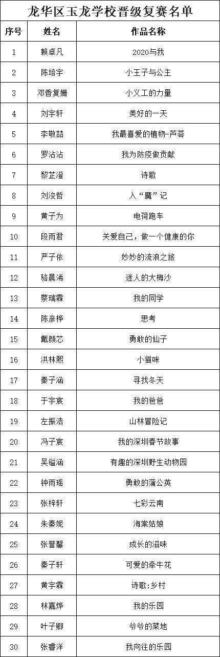 自2021年1月,活動征稿啟動以來,獲得了深圳市廣大中小學(xué)生、教師、文學(xué)愛好者的熱烈響應(yīng)積極參與,吸引了深圳百余所學(xué)校的上萬人關(guān)注報名?,F(xiàn)公布龍華區(qū)玉龍學(xué)校專場晉級復(fù)賽名單如下:
