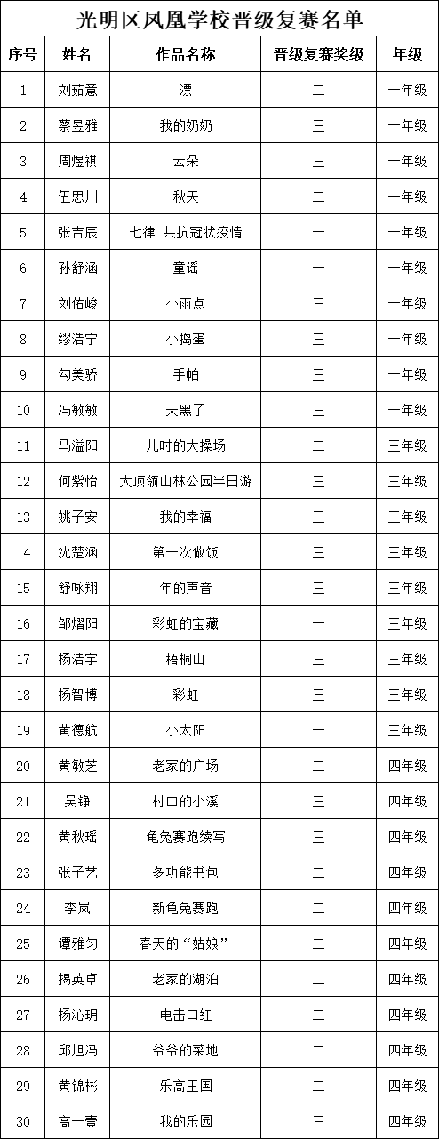 自2021年1月,活動征稿啟動以來,獲得了深圳市廣大中小學生、教師、文學愛好者的熱烈響應(yīng)積極參與,吸引了深圳百余所學校的上萬人關(guān)注報名?,F(xiàn)公布深圳市光明區(qū)鳳凰學校專場晉級復(fù)賽名單如下: