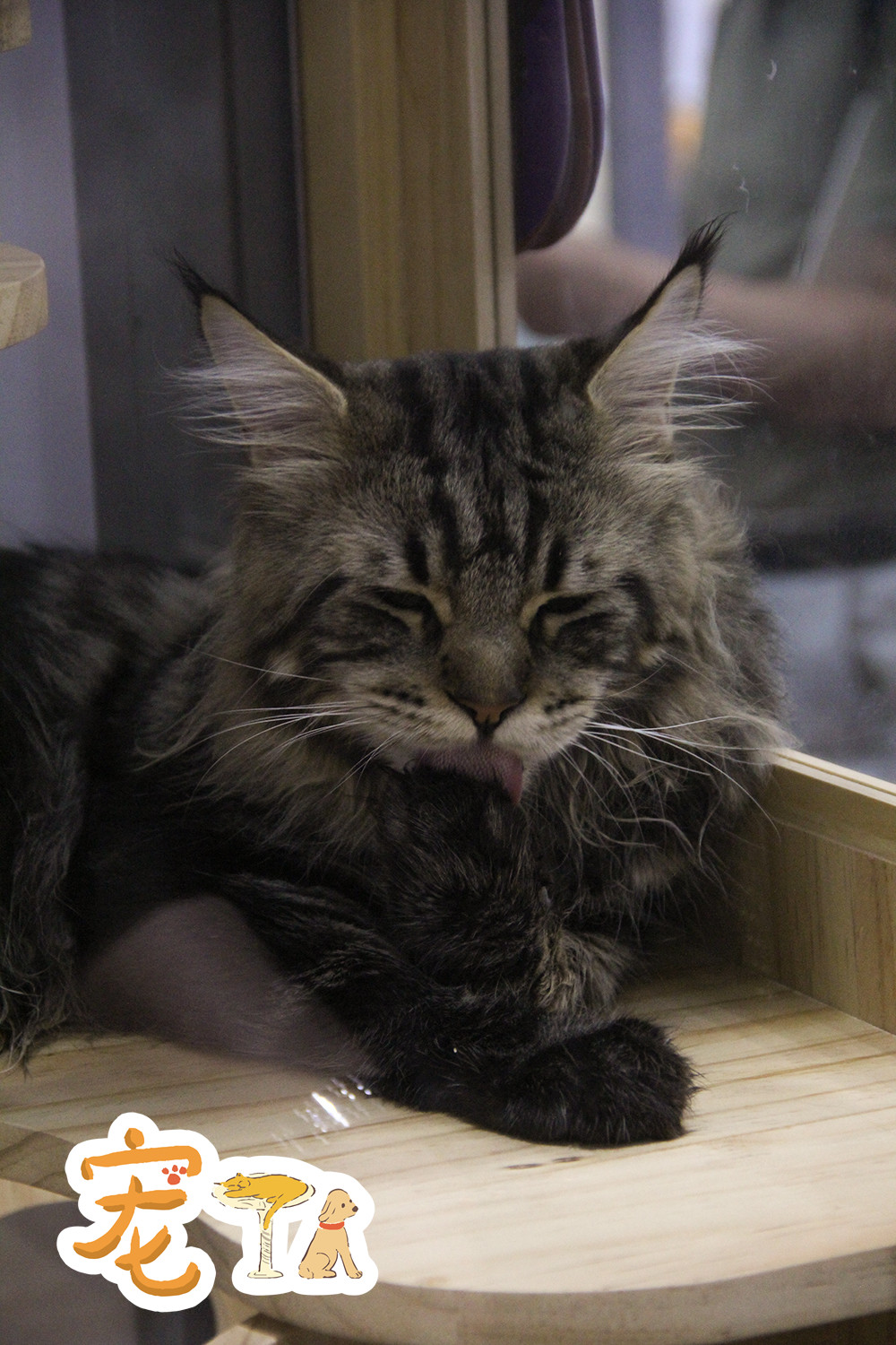 寵物活體展位,正在梳理毛發(fā)的緬因貓。