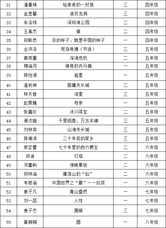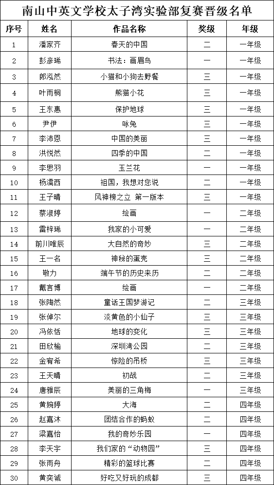 自2021年1月,活動(dòng)征稿啟動(dòng)以來,獲得了深圳市廣大中小學(xué)生、教師、文學(xué)愛好者的熱烈響應(yīng)積極參與,吸引了深圳百余所學(xué)校的上萬(wàn)人關(guān)注報(bào)名。現(xiàn)公布南山中英文學(xué)校太子灣實(shí)驗(yàn)部晉級(jí)復(fù)賽名單如下: