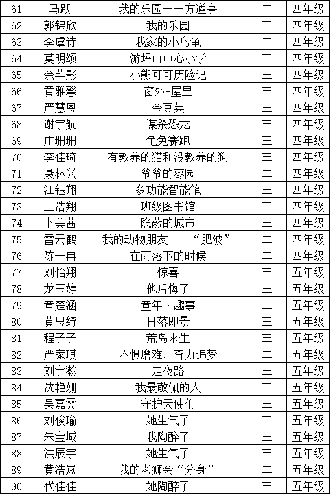 自2021年1月,活動(dòng)征稿啟動(dòng)以來(lái),獲得了深圳市廣大中小學(xué)生、教師、文學(xué)愛(ài)好者的熱烈響應(yīng)積極參與,吸引了深圳百余所學(xué)校的上萬(wàn)人關(guān)注報(bào)名?,F(xiàn)公布坪山區(qū)坪山中心小學(xué)晉級(jí)復(fù)賽名單如下: