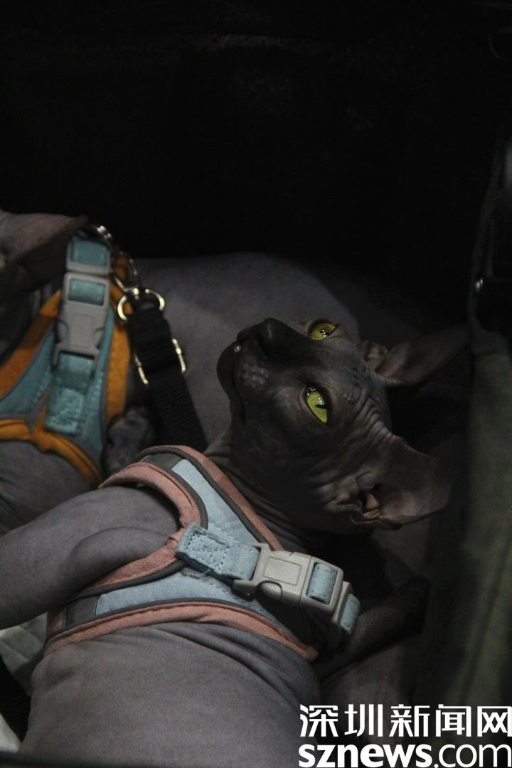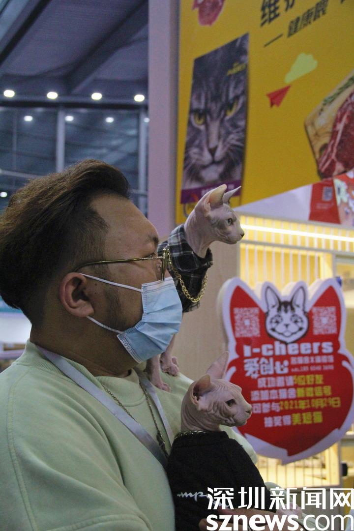 黏人的無(wú)毛貓與主人一同逛展。
