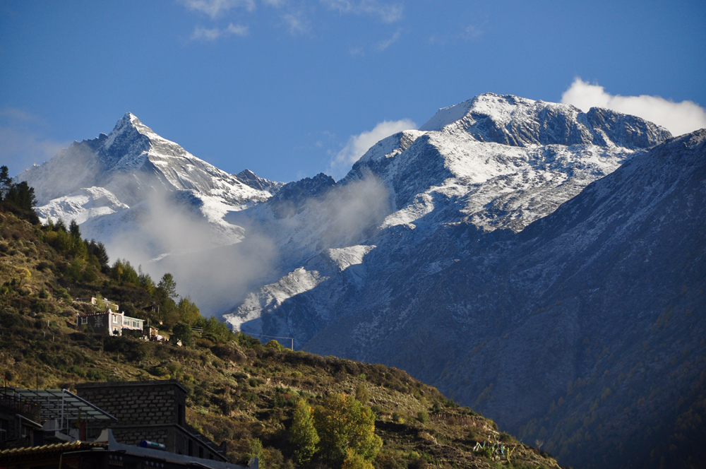 如果天氣晴好,在四姑娘山鎮(zhèn)旁山坡上的觀(guān)景臺(tái)可以眺望到同框的四座雪峰。李仁奇 攝