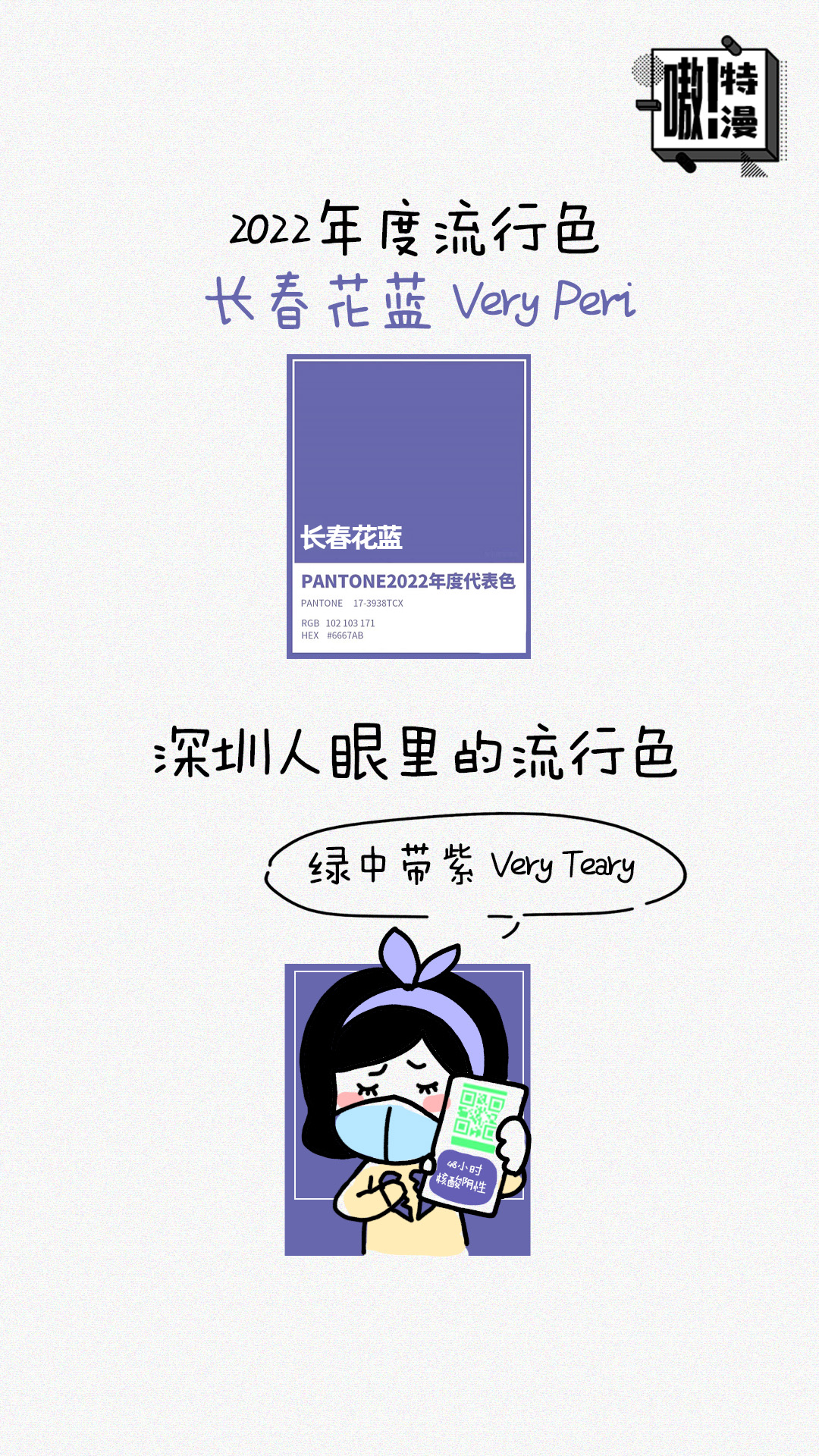 #嗷!特漫# 【#深圳人眼里的流行色是綠中帶紫# 】潘通(一家專門開發(fā)和研究色彩的權(quán)威機構(gòu))發(fā)布的2022年度流行色是名為very peri的長春花藍(lán)。而深圳人眼里的流行色則是綠中帶紫 Very Teary