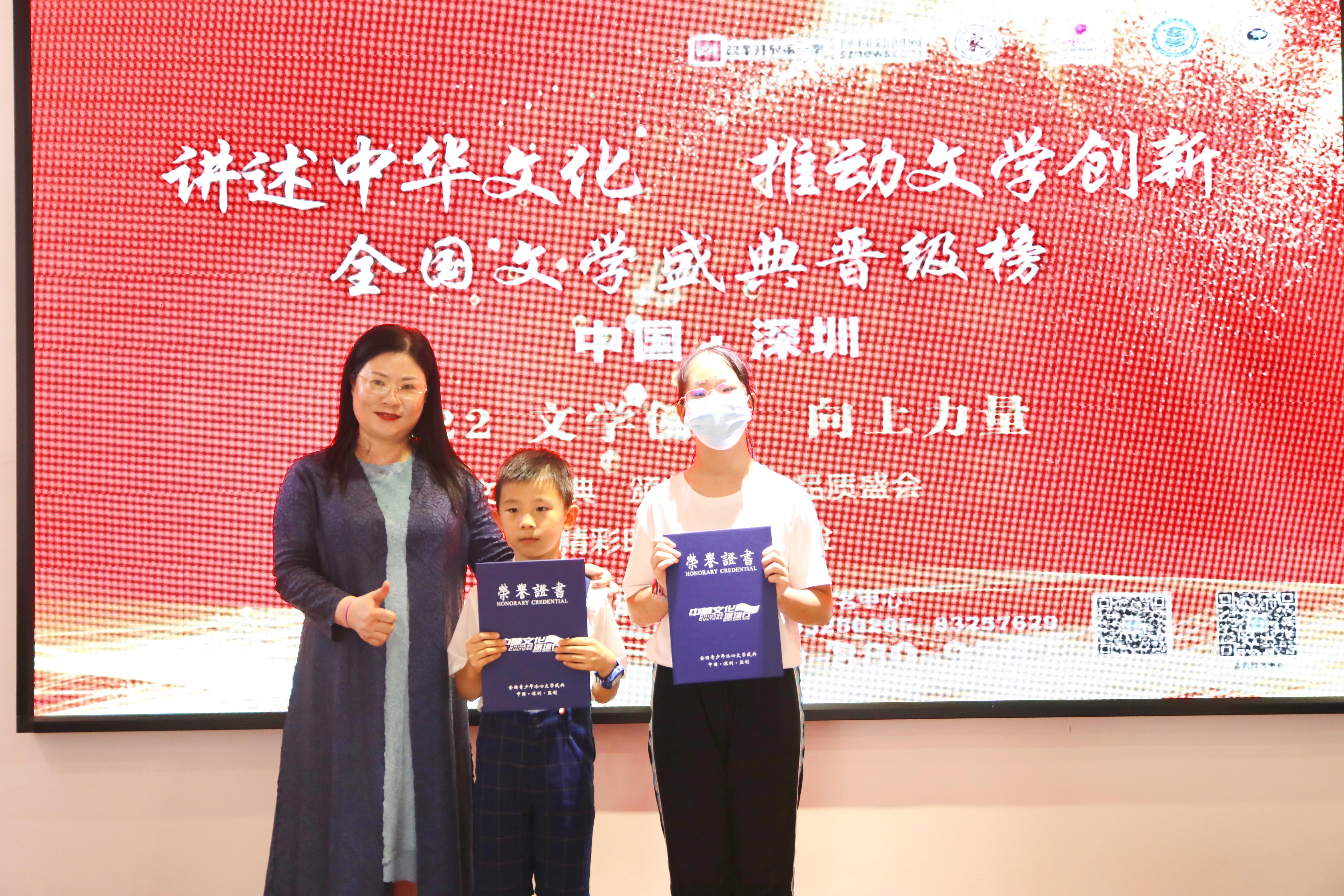 全國(guó)文學(xué)盛典聯(lián)合發(fā)起人、創(chuàng)始人肖硯寧為優(yōu)生代表頒獎(jiǎng)并合影