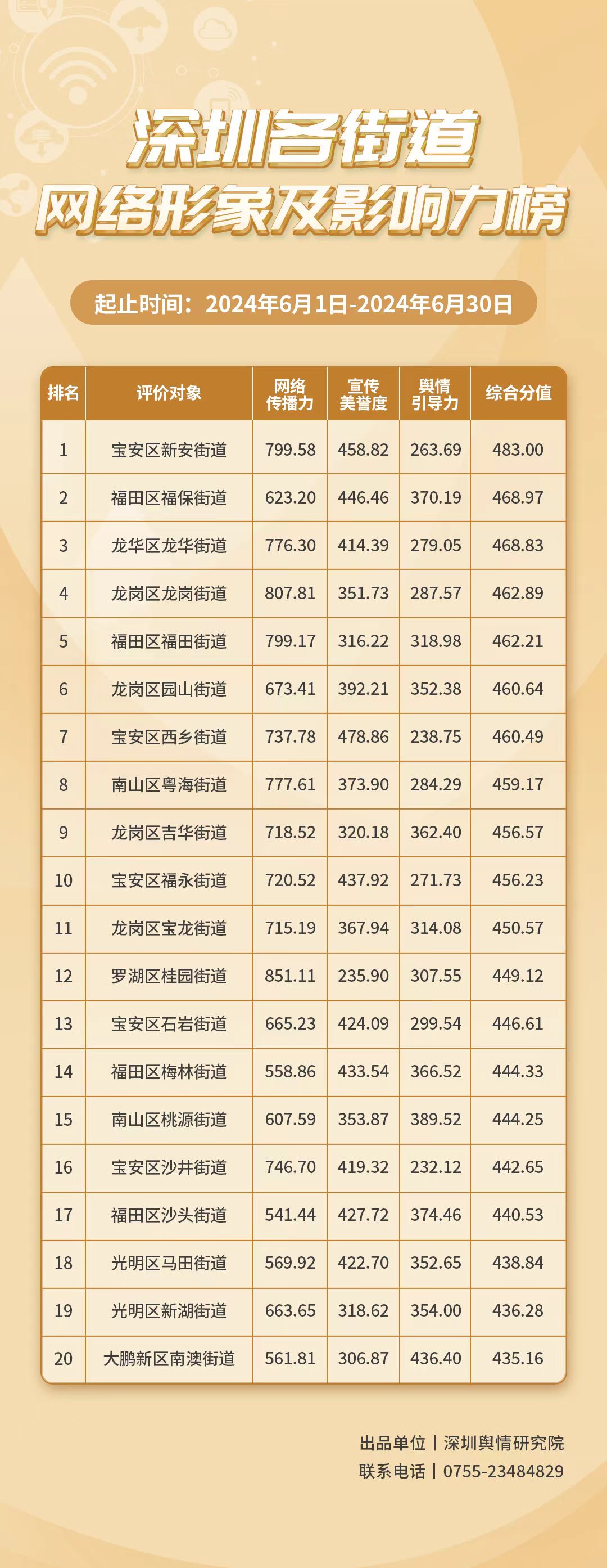 2024年6月,共有20個(gè)街道登上《深圳各街道網(wǎng)絡(luò)形象及影響力榜》,分別是:寶安區(qū)新安街道、福田區(qū)福保街道、龍華區(qū)龍華街道、龍崗區(qū)龍崗街道、福田區(qū)福田街道、龍崗區(qū)園山街道、寶安區(qū)西鄉(xiāng)街道、南山區(qū)粵海街道、龍崗區(qū)吉華街道、寶安區(qū)福永街道、龍崗區(qū)寶龍街道、羅湖區(qū)桂園街道、寶安區(qū)石巖街道、福田區(qū)梅林街道、南山區(qū)桃源街道、寶安區(qū)沙井街道、福田區(qū)沙頭街道、光明區(qū)馬田街道、光明區(qū)新湖街道、大鵬新區(qū)南澳街道。