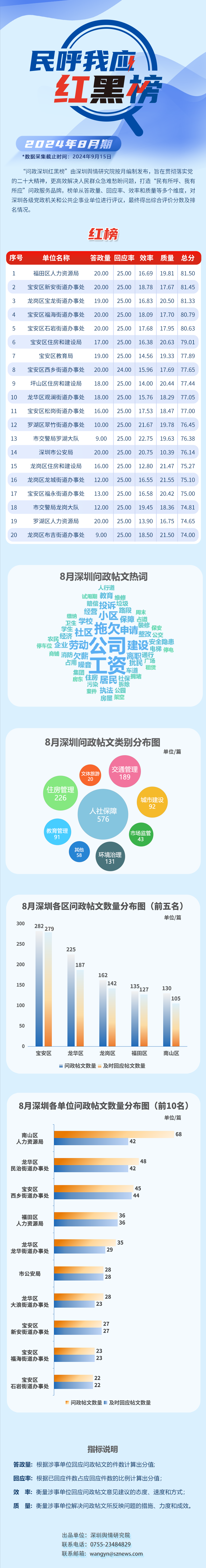 “深圳民呼我應(yīng)紅黑榜”由深圳輿情研究院按月編制發(fā)布,旨在貫徹落實黨的二十大精神,更高效解決人民群眾急難愁盼問題,打造“民有所呼、我有所應(yīng)”問政服務(wù)品牌。榜單從答政量、回應(yīng)率、效率和質(zhì)量等多個維度對深圳各級黨政機關(guān)和公共企事業(yè)單位進行評議,最終得出綜合評價分?jǐn)?shù)及排名情況。