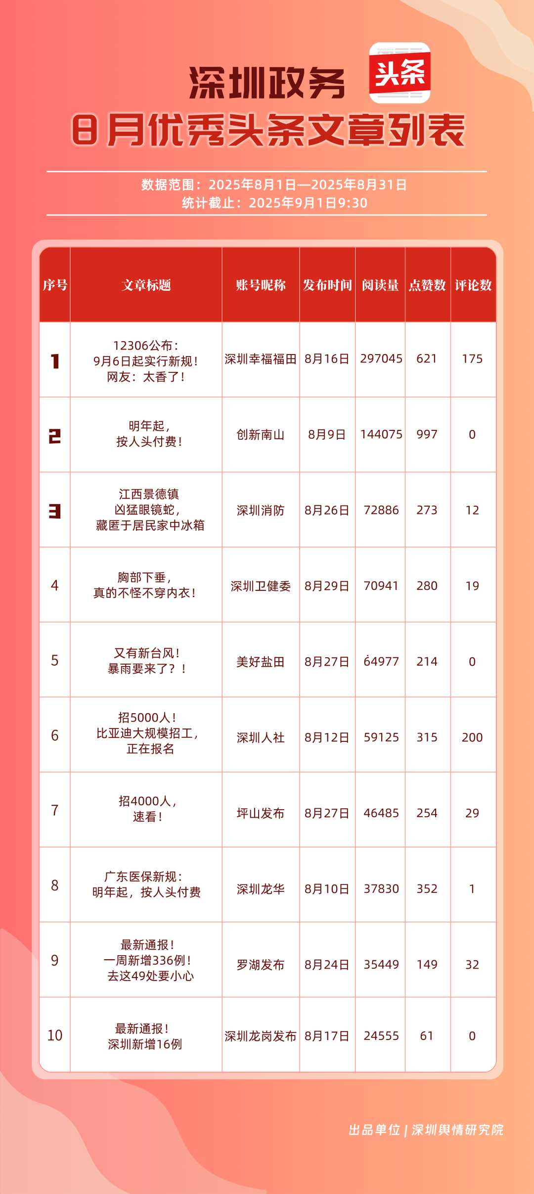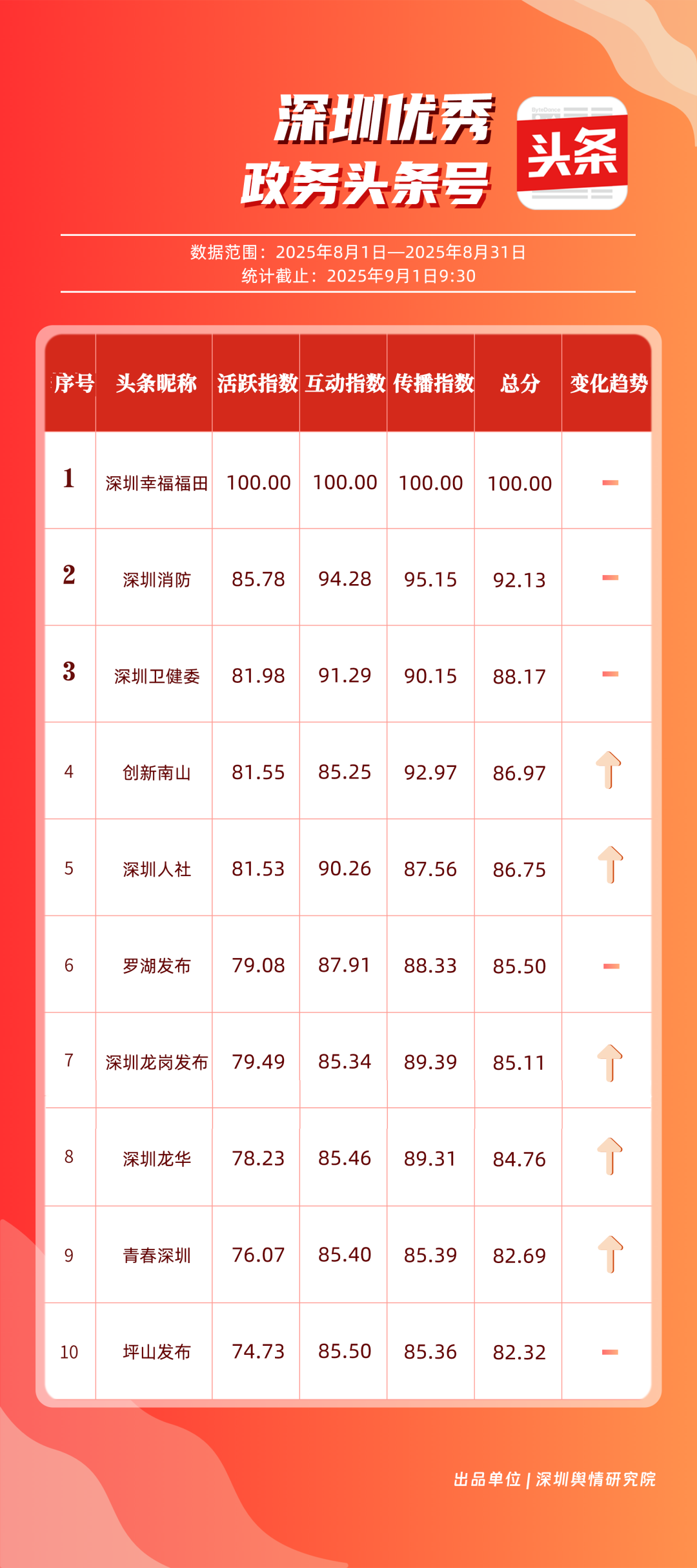 8月,“深圳幸福福田”“深圳消防”“深圳衛(wèi)健委”“創(chuàng)新南山”“深圳人社”“羅湖發(fā)布”“深圳龍崗發(fā)布”“深圳龍華”“青春深圳”“坪山發(fā)布”共10個政務頭條號入選“優(yōu)秀政務頭條號”榜單。“深圳幸福福田”憑借持續(xù)優(yōu)異的綜合表現(xiàn),以滿分成績穩(wěn)居榜單首位,彰顯出強大的政務傳播力與影響力;“深圳消防”“深圳衛(wèi)健委”則以穩(wěn)定的內容質量與深厚的民眾基礎,持續(xù)為市民提供權威、及時的服務信息,排名穩(wěn)固。“創(chuàng)新南山”“深圳人社”等上榜賬號亦表現(xiàn)亮眼,聚焦民生服務傳遞政策溫度,共同構成政務新媒體矩陣的中堅力量,為城市治理與民生服務注入鮮活動能。